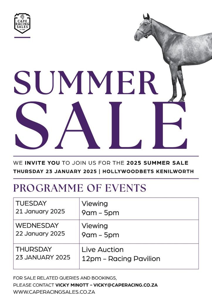 Cape Racing Sales looks forward to hosting this exciting event and invites all buyers to join us for an unforgettable experience at one of the most beautiful times of the year in the Cape. The Summer Sale provides a unique opportunity to purchase high-quality bloodstock amidst a week of action-packed events leading up to the highly anticipated WSB Cape Town Met race day, held at Hollywoodbets Kenilworth on Saturday, 25 January 2025.