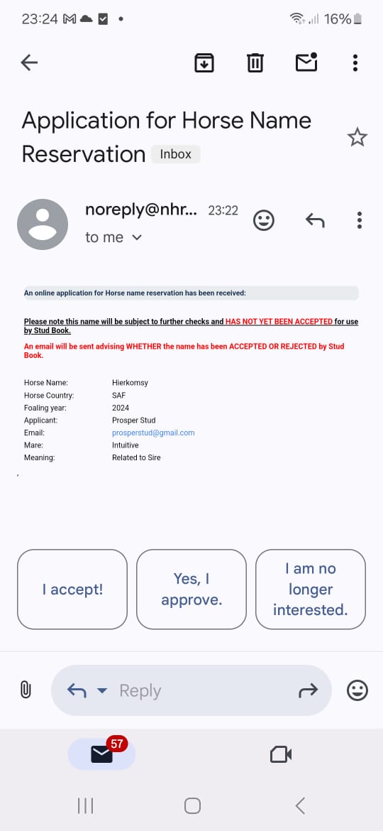 However, there was always going to be interest in the names of the colourfully-named Kommetdieding’s foals and the first to have a name applied for is a filly born at Prosper Stud at 21H00 last Thursday.