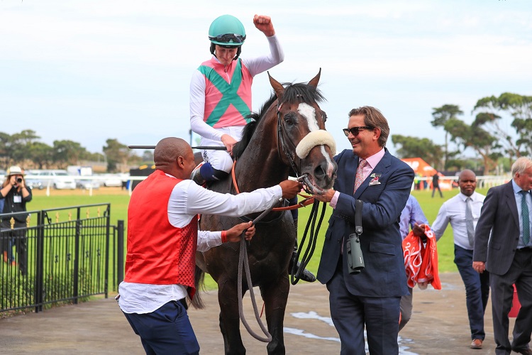 Daniel Muscutt and Double Superlative led into the winner’s enclosure by owner Nick Jonsson after winning the Gr 1 WSB Met (Picture: Wayne Marks)