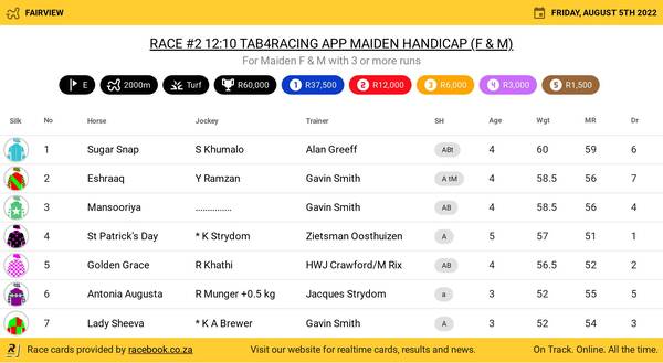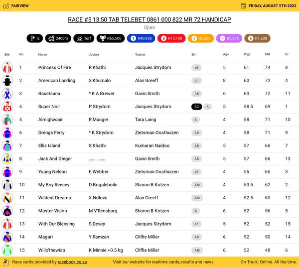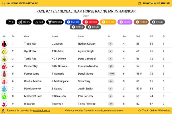 Hollywoodbets Greyville Turf Friday August 5 Fields