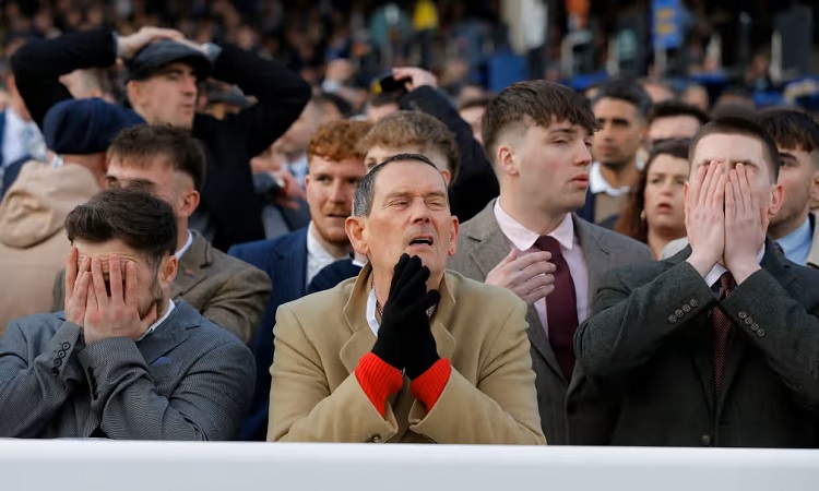 Racegoers in the grandstand react as Constitution Hill falls in the Champion Hurdle on day one of the Cheltenham festival Photograph: Tom Jenkins/The Guardian