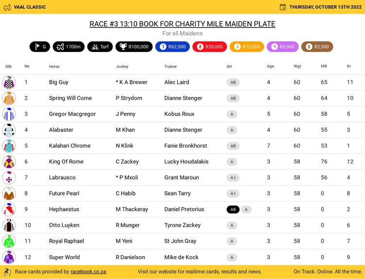 Entries for the Listed R250 000 Racehorse Owners Association Stakes over 1 600m (in order of draw, horse, age and sex, weight, merit rating, and trainer) for three-year-olds are: