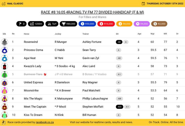 Entries for the Listed R350 000 Algoa Cup over 2 000m (in order of draw, horse, age and sex, weight, merit rating, and trainer) are: