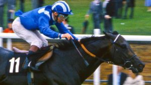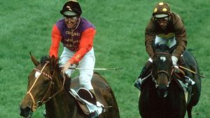 Willie Carson (left): won the 1977 Oaks with the Queen’s Dunfermline, pictured after the line with his whip in the backhand position Gerry Cranham (racingpost.com/photos)