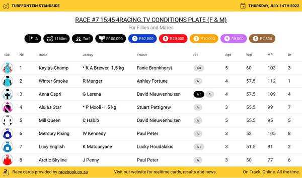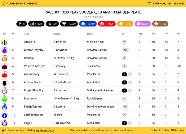 Lot 7, Funky Music (Capetown Noir), has won three races, with 14 places to his credit. His most recent win came at the Vaal late in May. He has not raced since, but is a perennial bread-and-butter handicapper, with more in his tank at four years of age.