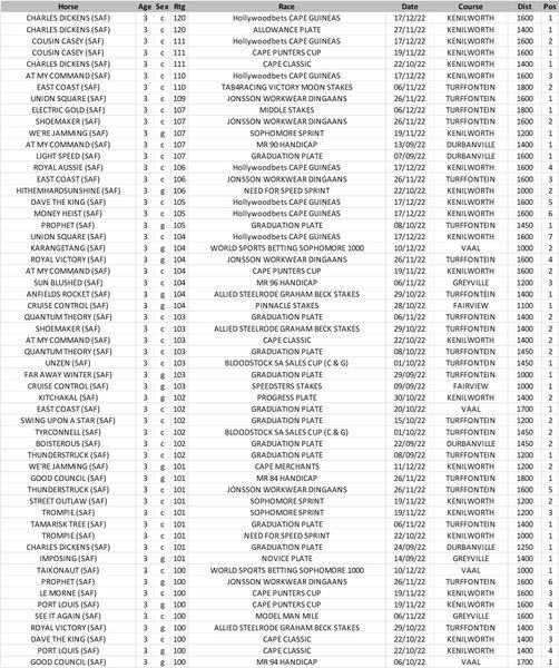 However, it is interesting to note Miedema rates last year’s Cape Guineas as superior to this year’s. He gave Double Superlative a 113 ability rating for his Cape Guineas win last year and only gave Charles Dickens a 110 for Saturday’s win, which was viewed by almost all and sundry as a performance for the ages.