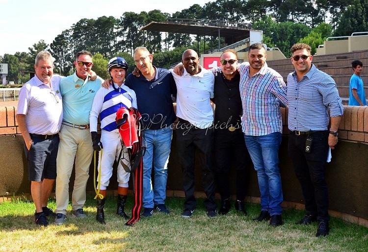 Piere Strydom poses for a photograph with the connections of Lady Of Power (Master Of My Fate) after an easy win at Vaal Classic today (JC Photos).