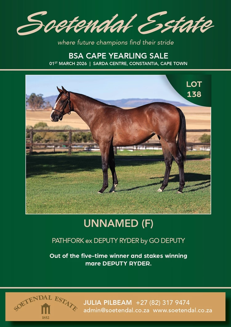 Riethuiskraal Stud, who foaled and reared this wonderful mare, will be offering several relatives of National Colour at the 2026 Premier Yearling Sale. This draft also includes the progeny of both promising and proven sires, with stallions represented in Riethuiskraal’s Premier Sale consignment including Digital Age, Jet Dark, Kommetdieding, Querari, The United States and What A Winter. Five potential standouts in this draft are: