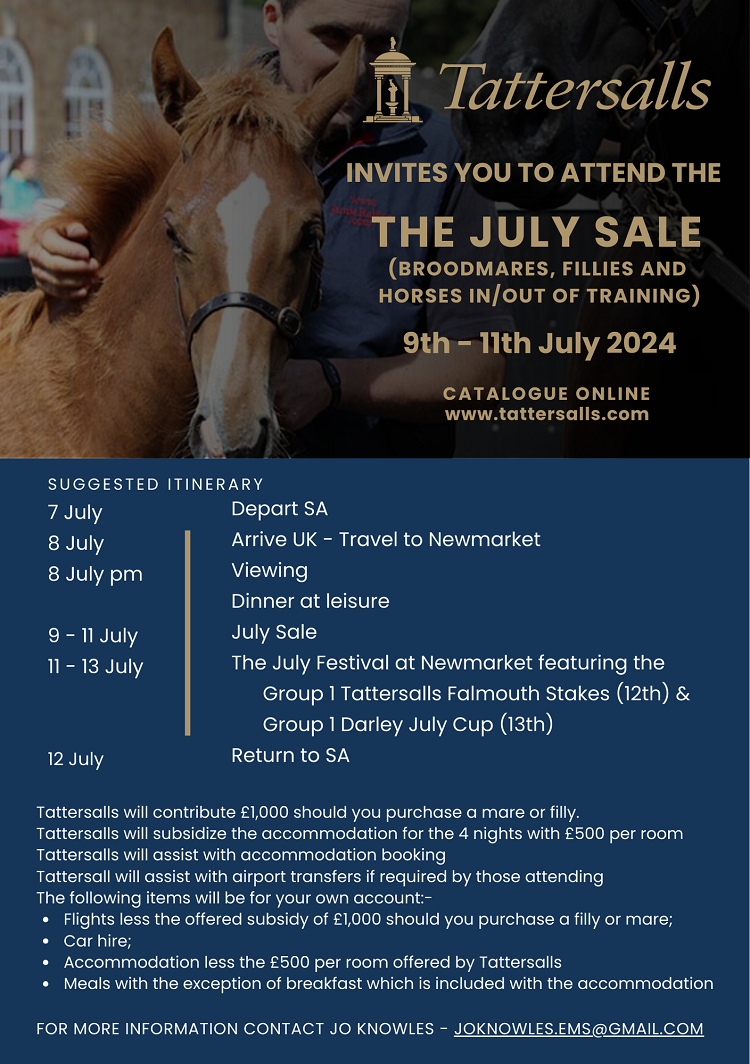 The Tattersalls July Sale might attract interest in South Africa with the recent opening up of direct flights to Europe, which will put the SA industry more in touch with the international scene. What makes it even more attractive is Tattersalls have a package in place for SA buyers which potentially subsidises their flights and subsidises their accommodation (see advertisement below)