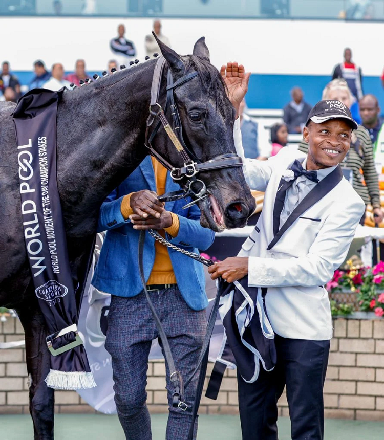 Sandringham Summit’s groom, Daniel Ciuane, donned the same snazzy outfit on Gold Cup Day at Greyville last July when his horse won the Premiers Champion Stakes. A R100,000 bonus was awarded to the groom of the winner as an initiative to celebrate the World Pool Moment of the Day. He used some of the money to finish building his house. He also bought a bakkie and assisted his unemployed father.