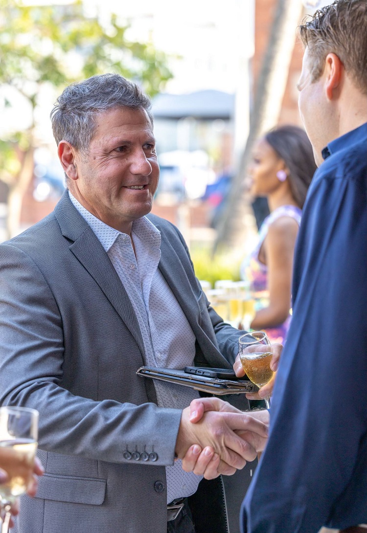 Twice July-winning trainer Sean Tarry greets Hollywoodbets Brand And Communications manager Devin Heffer at the HDJ Final Field And Draw Ceremony on Tuesday. Tarry’s smile tuned to a grimace when he drew 15 for Cousin Casey and 18 for Future Pearl but in typical style he had soon bounced back and was planning for the task at hand. (Candiese Lenferna Photography)