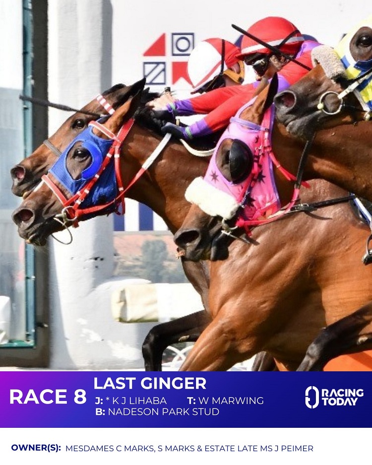 The Weiho Marwing-trained Oratorio filly Last Ginger with Kobeli Lihaba up scored a 20/1 shock today (Thursday) in the last race at Turffontein Inside and denied favourite backers by the narrowest of margins, beating Gavin Lerena and the Gimmethegreenlight filly Accept Cookies. (JC Photos)